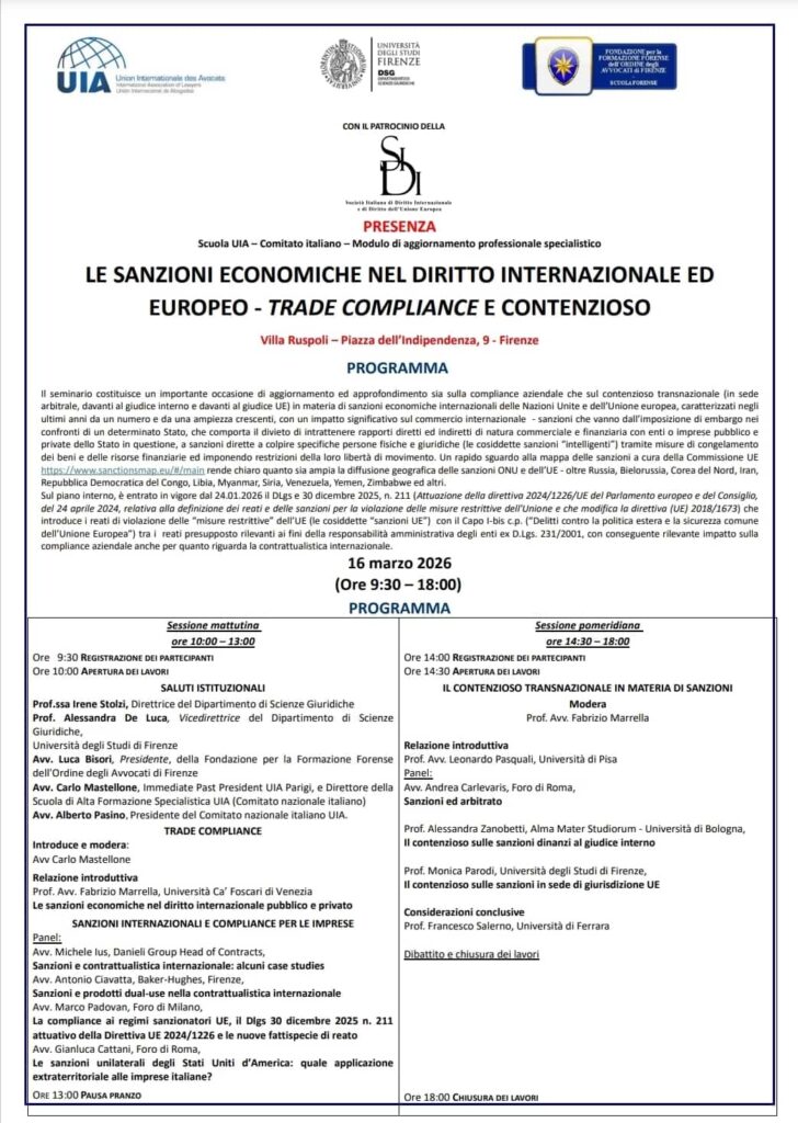 Organizzato dalla Scuola UIA Comitato italiano con Dipartimento Scienze Giuridiche Università Firenze e Fondazione Formazione Forense Firenze, l’evento ha analizzato compliance aziendale, contenzioso transnazionale e sanzioni economiche ONU-UE, con approfondimento sul D.Lgs. 30 dicembre 2025, n. 211 (attuazione Direttiva UE 2024/126) che introduce reati per violazione misure restrittive UE.