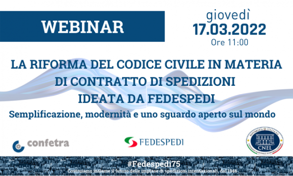 17 marzo 2022: Convegno di presentazione delle modifiche al Codice civile in materia di contratto di spedizioni, organizzato da Fedespedi, CNEL e Confetra