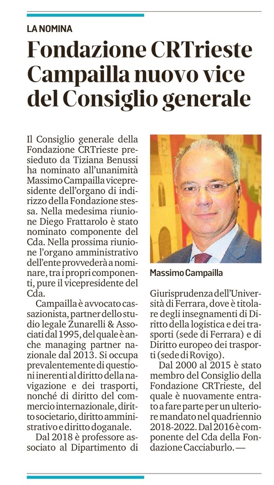 Il Prof. Avv. Massimo Campailla nominato Vicepresidente della Fondazione Cassa di Risparmio di Trieste