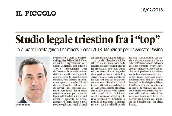 Studio legale triestino fra i “top”: Lo Zunarelli nella Guida Chambers Global 2018. Menzione per l’Avvocato Pasino