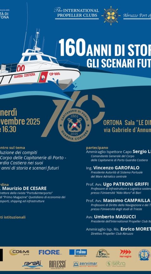 In occasione del 160° anniversario del Corpo delle Capitanerie di Porto – Guardia Costiera, venerdì 14 novembre 2025, alle 16:30, la Sala “Le Dimore” di Ortona (via Gabriele d’Annunzio, 10) ospiterà l’incontro “160 anni di storia – Gli scenari futuri”, promosso dal Propeller Club Port of Abruzzo – Ortona e da The International Propeller Clubs,…