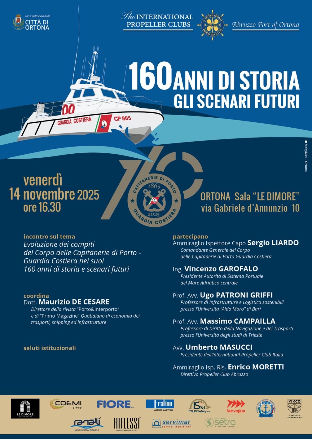 In occasione del 160° anniversario del Corpo delle Capitanerie di Porto – Guardia Costiera, venerdì 14 novembre 2025, alle 16:30, la Sala “Le Dimore” di Ortona (via Gabriele d’Annunzio, 10) ospiterà l’incontro “160 anni di storia – Gli scenari futuri”, promosso dal Propeller Club Port of Abruzzo – Ortona e da The International Propeller Clubs, con il patrocinio della Città di Ortona e il sostegno di numerosi stakeholders locali.